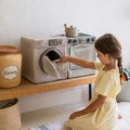 Esta lavadora de cestas de juguetes textiles es el sueño hecho realidad. ¡Los pequeños imitadores pueden imitar a mamá y papá en la máquina para un giro rápido de Rug-Cycle cubierto con un poco de detergente de mentira! Esta canasta de almacenamiento y juguete textil todo en uno incluso cuenta con una puerta batiente, un interruptor giratorio y un dispensador de jabón. ¡El conjunto perfecto para estimular el juego simbólico de los bebés!