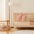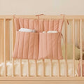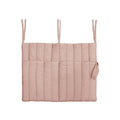 PERCHA CUNA BOLSILLO OLIVA Fabricada en suave algodón orgánico, acolchada en líneas verticales simulando las cañas de bambú, la percha Crib Pochet tiene dos grandes bolsillos para guardar cosas y cordones para sujetarla a la cuna. La percha de bolsillo está suavemente acolchada con polyfill reciclado certificado por GRS y decorada con una hoja de bambú bordada en color a juego.