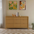 ESTÉTICA DE INSPIRACIÓN BOHO: La cómoda Bondi celebra el diseño de inspiración boho con sus cálidos tonos de madera, patas redondeadas y tiradores de cajones de cuero.
