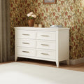 La cómoda Beckett de 6 cajones es el complemento perfecto para la cuna Beckett, con sus sencillas patas cónicas, su moderno borde de 45 grados y la moldura elevada del panel del cajón. Los cajones, con construcción en cola de milano, son totalmente extraíbles y cuentan con guías con cojinetes de bolas y cierre automático para facilitar su uso.